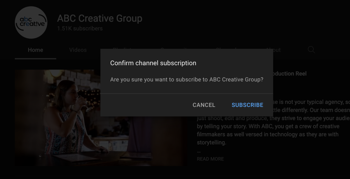 Simply get your Channel URL by selecting “Your Channel” after clicking on your profile while logged in. Attach ?sub_confirmation=1 to that URL and you’ll get something that looks like this when visitors go to your channel.