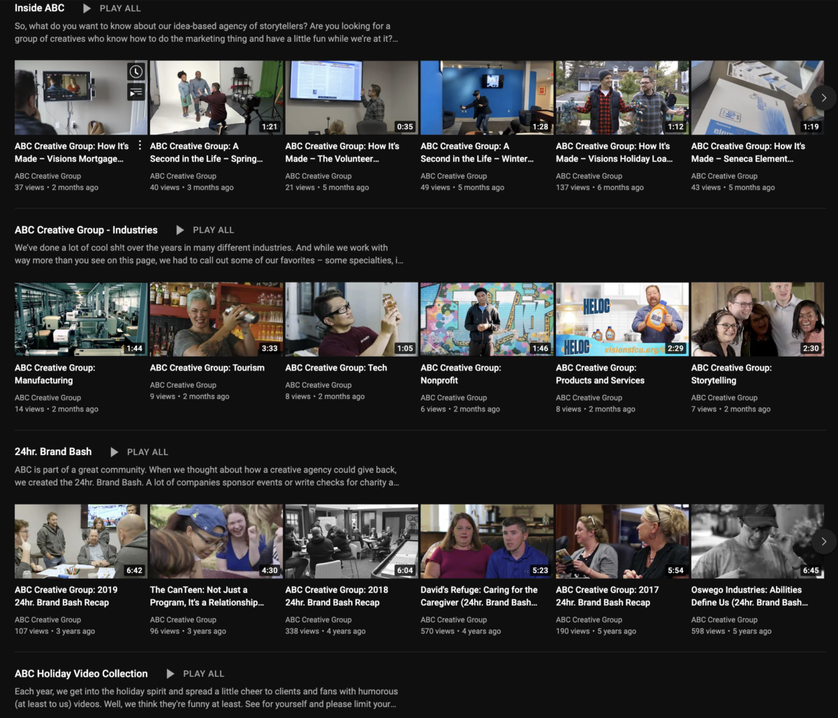 Another tactic for discovery, not to mention a kickass landing page for your channel, is creation of as many playlists as possible. Group similar videos into these “categories.” Not only will this help viewers find what they want to engage with from your channel landing page, but you can also add descriptions to each playlist to once again help with search.