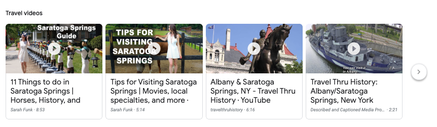 Like photos, Travel leans heavily on another Google property for crowdsourced content: YouTube. Video is perhaps the best way to land branded content on a Google Travel page. Copy-based content doesn’t have their own featured area on Travel, but videos do.