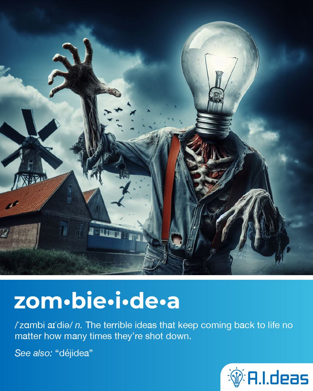 We went digging through the archive, dusted off the definitions and the Art Department went to work prompting AI software to visualize them. The results of this experiment ranged from waaay off to dead on. We had some laughs at the terrible ones, tweaked the best and trickled them out on our social media as AIdeas.