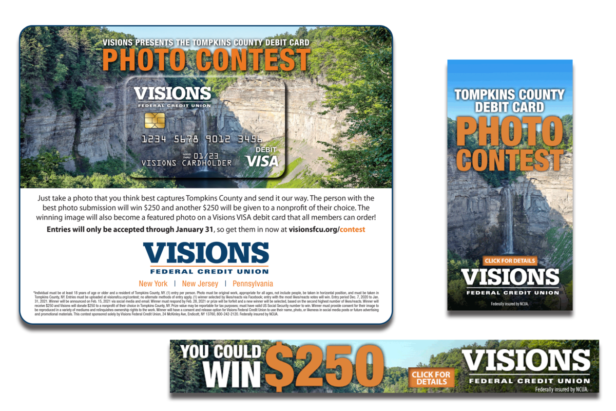 A photo contest invited entries from residents that showed off Tompkins County scenes. The winning image appeared on a debit card available to all Visions members. To take the community involvement even further, Visions had Facebook followers vote for the winner.