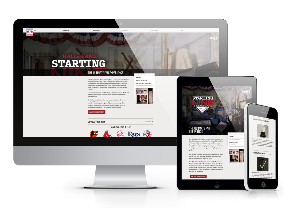 The Starting Nine was a complete multimedia experience intended to draw more fans to the Museum. The campaign consisted of web pages for the campaign itself as well as each of the 30 Major League Baseball teams. Fans of each team took part in a treasure hunt of sorts to find artifacts specific to their favorite ballclub, complete with an interactive checklist. The campaign was supported by print, digital and social advertising strategically aimed at drive-time markets.