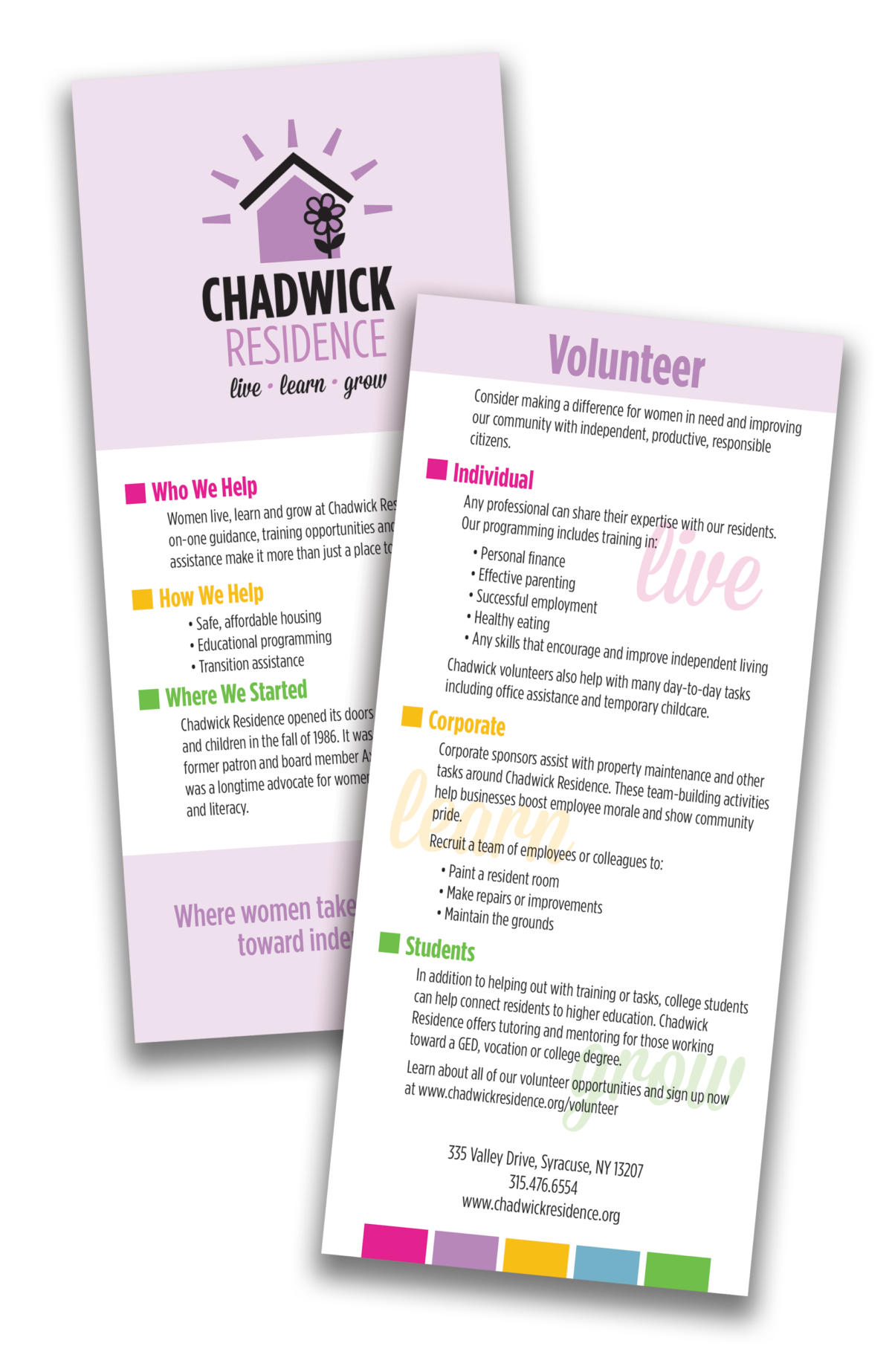 The Chadwick Residence mission and experience focus on sustainable, independent living. Programming covers a wide array of life skills, including personal finance, effective parenting and successful employment. They receive referrals from Central New York homeless shelters, social service agencies, churches and schools. The organization relies on the support of volunteers and donations to serve at-risk women and their children with housing assistance both on the premises and in the community.