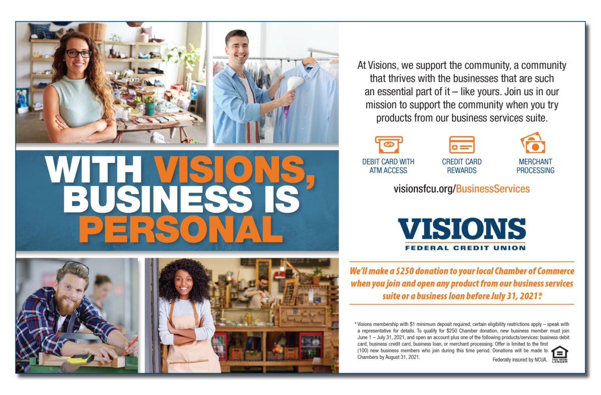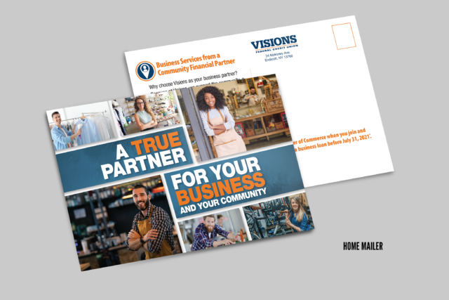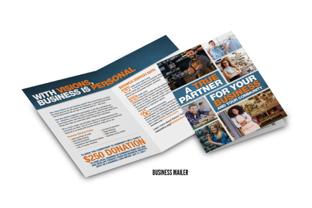 Research showed us, however, that the business services were not unique and we would need to develop messaging focused on banking local. Under the tagline “A True Partner for Your Business and Your Community,” messaging was rooted in Visions’ signature commitment to community and delivered to small businesses of no more than 15 employees. We wanted to emphasize that by backing local businesses, Visions helps strengthen the communities these businesses call home. To illustrate this, Visions made a substantial donation to local Chambers of Commerce for each new signup.